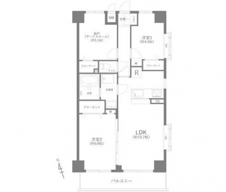 専有面積 | 66u | 間取り | 2SLDK (LDK13.7/洋室6.8/洋室4.2/S5.1) | ||