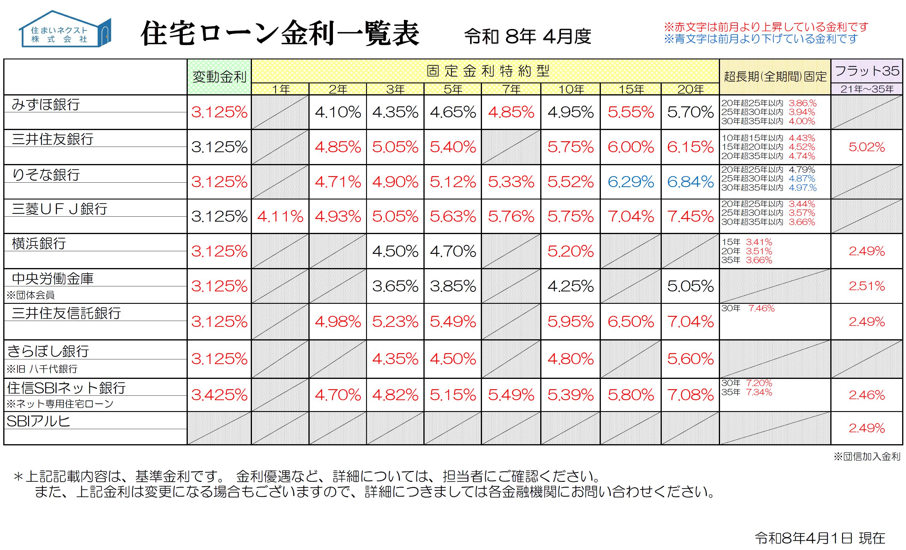 住宅ローン金利一覧 2026年4月度「只今金利上昇中!物価上昇も追い打ちで家計はどうなる?」【2026-04-01更新】お知らせ | 中古マンション専門【仲介手数料無料のゼロネクスト】の不動産のことなら住まいネクスト株式会社
