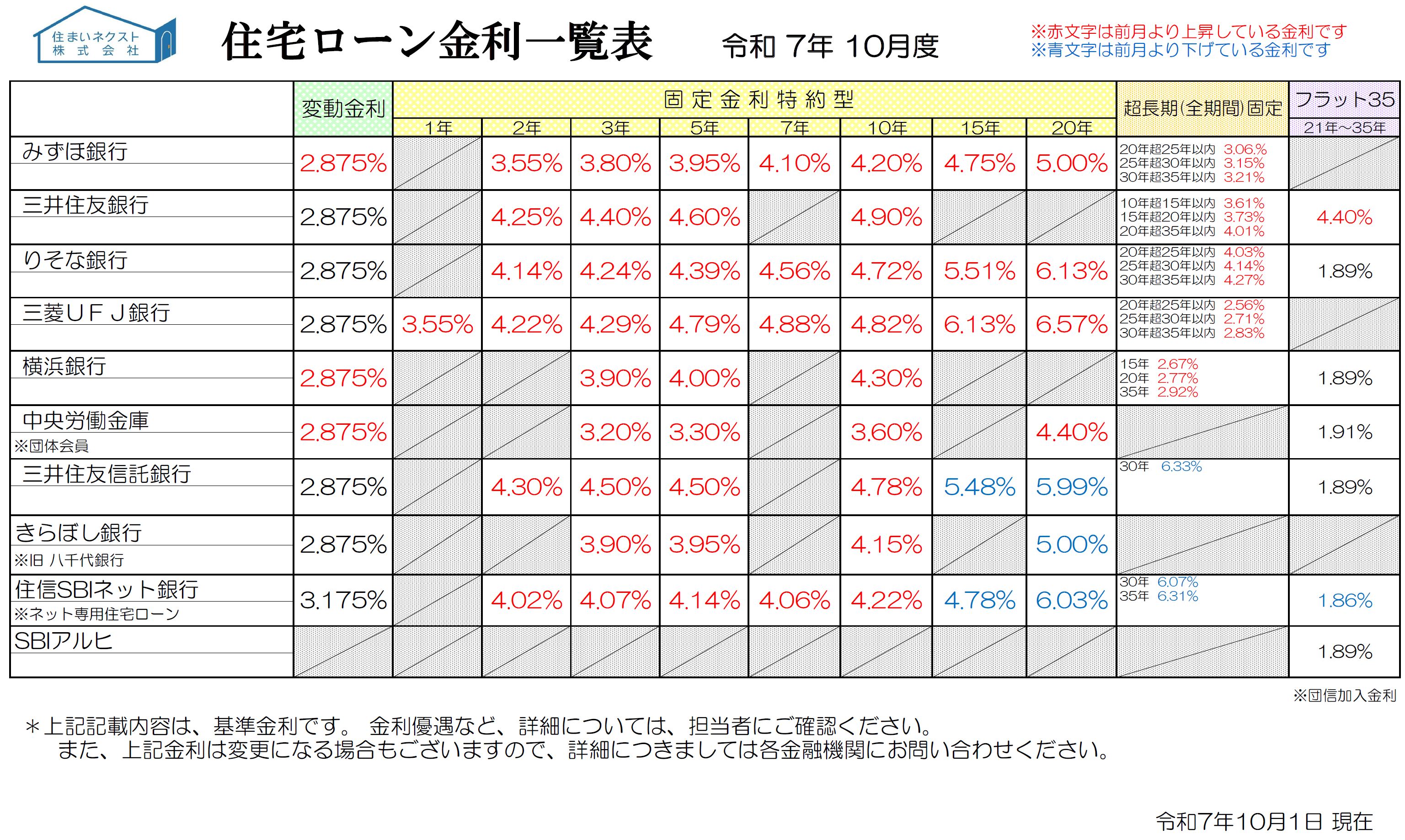 住宅ローン金利一覧 2025年10月度