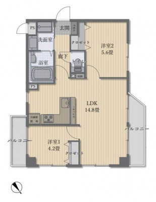 専有面積 | 55.18u | 間取り | 2LDK (LDK14.8/洋室5.6/洋室4.2) | ||