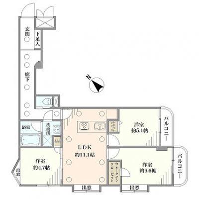 専有面積 | 66.35u | 間取り | 3LDK (LDK11.1/洋室6.6/洋室5.1/洋室4.7) | ||