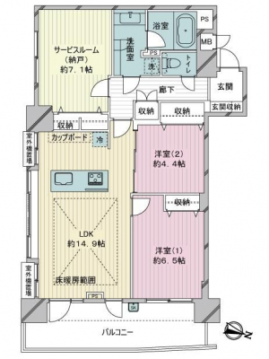 専有面積 76.22u 間取り 2SLDK (LDK14.9/洋室6.5/洋室4.4/S7.1)
