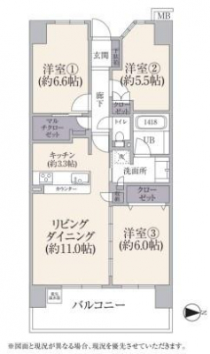 専有面積 | 71.97u | 間取り | 3LDK (LDK14.3/洋室6.6/洋室6/洋室5.5) | ||