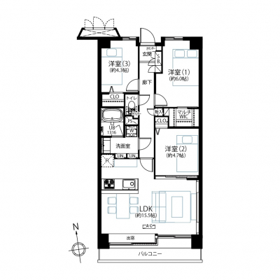 専有面積 | 66.85u | 間取り | 3LDK (LDK15.5/洋室6/洋室4.7/洋室4.3) | ||