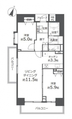 専有面積 58.86u 間取り 2LDK (LDK14.8/洋室5.9/洋室4)