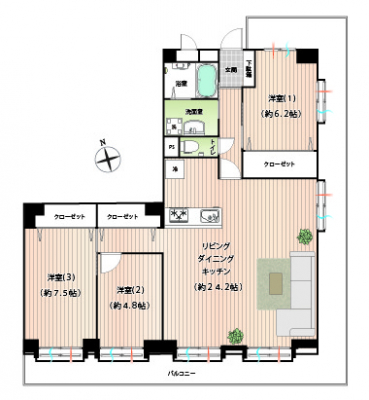 専有面積 | 93.23u | 間取り | 3LDK (LDK24.2/洋室7.5/洋室6.2/洋室4.8) | ||